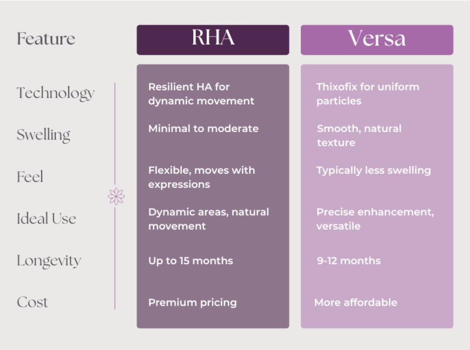 Results may vary. Both RHA and Versa are FDA-approved treatments administered by licensed medical professionals. Individual results depend on factors including age, skin type, lifestyle, and treatment area.